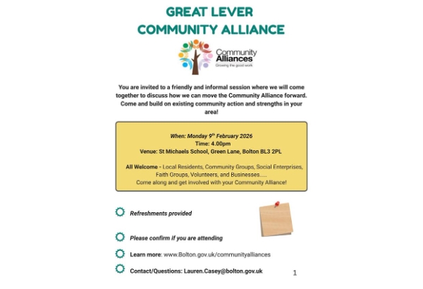 Please see attached information for the next Great Lever Community Alliance meeting - Monday 9th February 2025 4PM at St Michaels School, Green Lane BL3 2PL where community residents, groups, organisations, and business can gather to have discussions around positive change and find a way forward to continue the great work and empower communities.