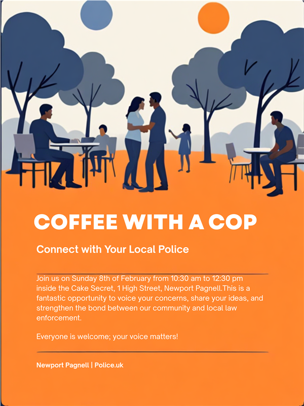 Your local Neighbourhood Team will be holding a Coffee with a Cop from 10:30AM - 12:30PM on Sunday 8th February 2026 at Cake Secret, 1 High Street, Newport Pagnell . Please take this opportunity to raise any concerns you may have and to find out what we are doing to tackle the issues that matter to you.