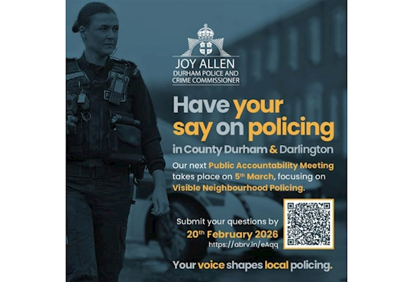 Residents across County Durham and Darlington are being encouraged to have their say on neighbourhood and visible policing by submitting questions for the next Public Accountability Meeting. The meeting, taking place on Wednesday 5 March, will see the Police and Crime Commissioner put residents’ questions directly to the Chief Constable and senior police leaders, focusing on issues that matter most to local communities. The theme for the meeting will be Neighbourhood Visible Policing, including police presence in communities, tackling antisocial behaviour, engagement with residents, and how local concerns are being addressed. Neighbourhood policing is a key priority in the Commissioner’s Police, Crime and Justice Plan, reflecting what residents consistently say they want – to see officers in their communities, feel reassured, and know that everyday safety issues are being taken seriously. People are invited to submit questions about policing in their area, whether that relates to visibility, antisocial behaviour, response to concerns, or how neighbourhood teams work with local residents. Questions do not need to be formal or technical. A selection of questions received by the deadline will be asked at the meeting on behalf of the public. Police and Crime Commissioner Joy Allen said: “Neighbourhood policing is about what people experience day to day – seeing officers in their area, feeling safe where they live, and knowing their concerns are being listened to.