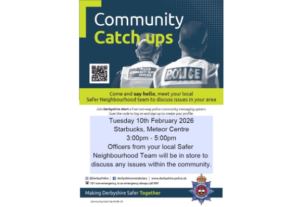 **Community Catch Up** Local residents have the chance to drop-in and speak to officers from our team tomorrow at our latest event. We will be at Starbucks, Meteor Centre on Tuesday 10th February between 3:00pm-5:00pm. You can speak to us about any concerns or issues you may have in your community, pick up crime prevention advice or find out more about our Derbyshire Alert messaging system. If you are unable to make it, you can also contact your local policing team using any of the following non-emergency contact methods below: · Website – We have crime reporting tools on our website: https://www.derbyshire.police.uk/ · Facebook – send us a private message to the Derbyshire Constabulary Facebook page · Phone – call us on 101
