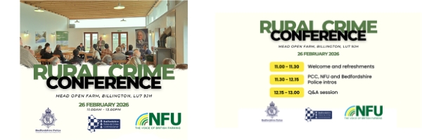 Join us for the Rural Crime Conference, hosted by Bedfordshire’s Police and Crime Commissioner John Tizard alongside Freya Morgan, Bedfordshire & Huntingdon NFU - National Farmers' Union Chair and Bedfordshire Police.