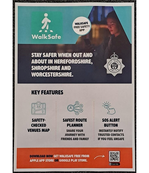 West Mercia are promoting the use of the WalkSafe app, which is free to download from the usual appstores, and promotes Safety and guardianship whilst out in public spaces. The force aims to focus on VAWG offences (Violence against women and girls) but it is available to all and the app's features are universal in the aim to keep everyone safe. Have a look at the attached picture to see how to get it