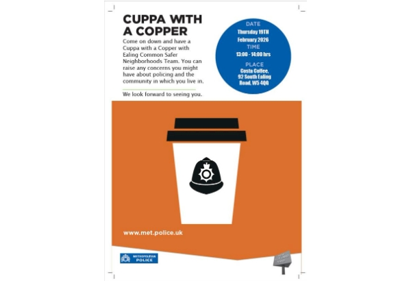 Ealing Common SNT are holding their next Cuppa with a Copper event on Thursday 19th February 2026 at 1pm in Costa Coffee, 92 South Ealing Road, Ealing, W5 4QG.