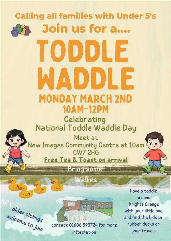 We are pleased to share details of a free community event, Toddle Waddle, taking place on Monday 2nd March at 10am. The morning will begin at New Images Youth & Community Centre, where families will be welcomed with free tea and toast. Then make their way over to Knights Grange for a fun and engaging rubber duck hunt—perfect for young children to explore and be active. Families are encouraged to bring their wellies, and while the event is aimed at children under five, older siblings are very welcome to join in too. This event is completely free and open to all, and is designed to encourage physical activity, social interaction, and family fun within our local community. Please book via office@WYCF.co.uk or call 01606 593724. |