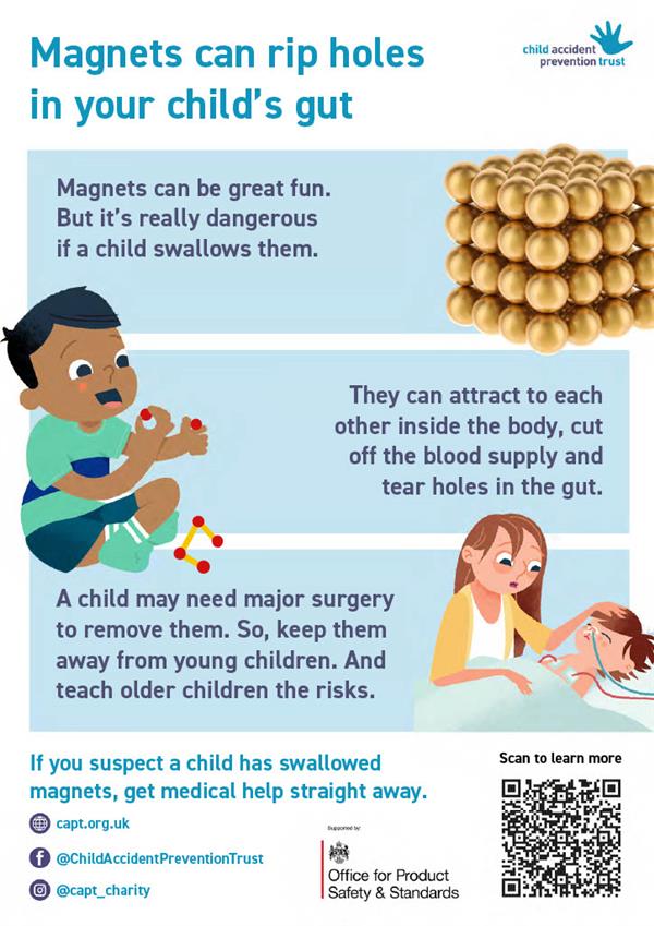 A four-year-old boy died days after swallowing two small magnets. An inquest revealed he ate two 1cm-by-1cm pink magnets that were on his fridge. Those magnets attracted together inside his body, tearing a hole in his bowel. This led to acute sepsis and the heart attack that killed him. Sadly, this isn’t an isolated incident. For safety guidance see the image below. More information here: A four-year-old boy died days after swallowing two small magnets