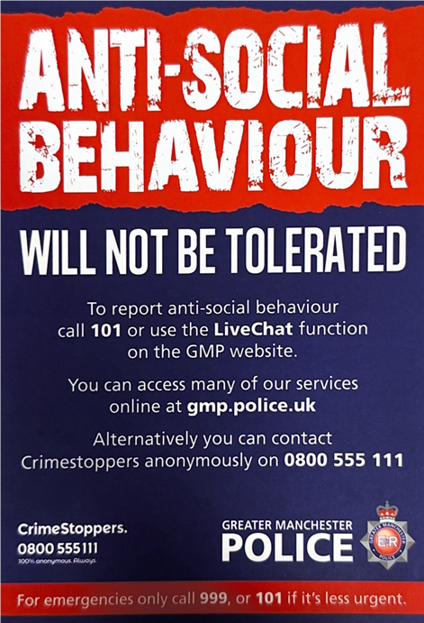In regard to recent anti-social behaviour in the Hulme and Hulme High Street area, if you notice anything ongoing in the area please call 101 or 999 in an emergency.