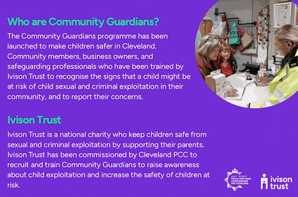 Police and Crime Commissioner Matt Storey has recently commissioned a Community Guardians programme to operate in the Cleveland Police force area. Community Guardians are community-based volunteers who engage with children and young people to identify potential risks of exploitation and respond appropriately. They play a crucial role in preventing and responding to child exploitation, by being the 'eyes and ears' of their communities to spot the signs of grooming. He appointed national exploitation experts the Ivison Trust to deliver the programme in Cleveland. They will train volunteers in a two-hour Teams course, where they will learn how to spot exploitation and how to share information with relevant agencies - including Cleveland Police. If you know any community members who would be perfect to be a Community Guardian, please ask them to visit the below website and register ⬇️ Community Guardians - Ivison Trust The Ivison Trust are also keen to visit groups within the community - if you would like to invite them to a community event or meeting, please email: community.guardians@ivisontrust.org.uk