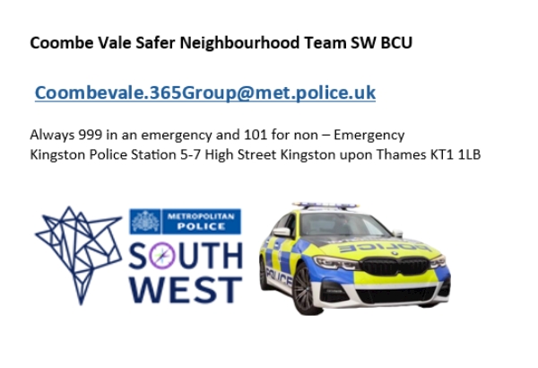 You can contact your local Safer Neighbourhood Team directly by email with any concerns, suggestions or community issues. Our email is: Coombevale.365Group@met.police.uk If you want to report an ASB(anti-social-behaviour) or any crime, please call 999 in an emergency and 101 for non-emergency. Or you can report online via www.met.police.uk