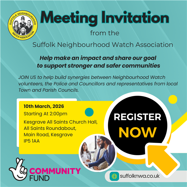 The Suffolk Neighbourhood Watch Association would welcome your attendance at our forthcoming Southern Area Command meeting to help make an impact and share our goal to support stronger and safer communities. Joining us will help build synergies between Neighbourhood Watch volunteers, the Police, and Councillors and representatives from local Town and Parish Councils. Our speakers will include Inspector Colin Clack, South Command Policing Area; Trading Standards, and an Executive member of the Suffolk Neighbourhood Watch Association. FREE refreshments will be provided When: Tuesday 10th March 2pm Where: Kesgrave All Saints Church Hall, All Saints Roundabout, Main Road, Kesgrave. IP5 1AA To register for this event please visit our website - https://suffolknwa.co.uk/southern-event.php Best wishes
