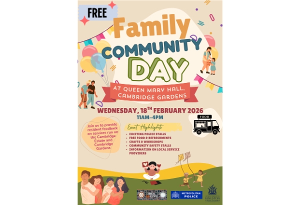 Today between 11:00am and 4:00pm Community Day Event will take place in Queen Mary Hall in Cambridge Gardens. Please find attached the leaflet including details about the event. You are all welcome to join us in this event.