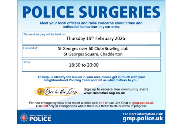 Police and local councillors are holding a surgery. Please call in and discuss any local issues or concerns you have.