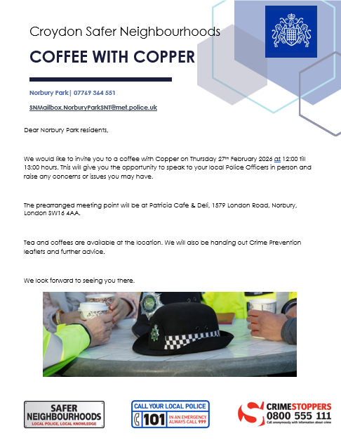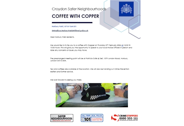 Please see the poster for ‘Coffee with a Copper’, your chance to have a chat with your local police. Thursday 27th Feburary between 12.00 - 13.00