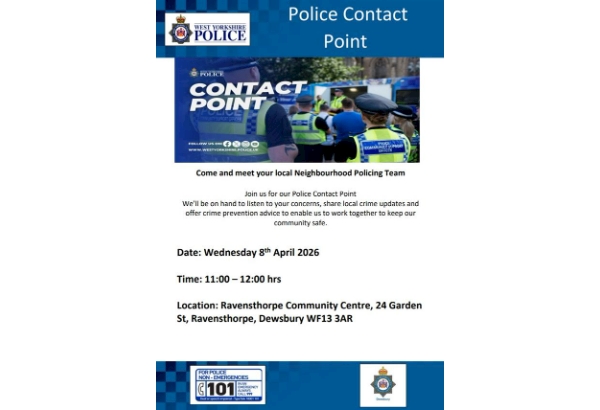 Join us for our Police Contact Point We’ll be on hand to listen to your concerns, share local crime updates and offer crime prevention advice to enable us to work together to keep our community safe.