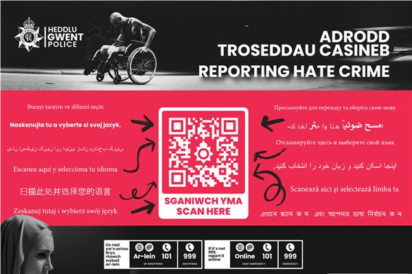 I wanted to provide you with an update regarding Hate Crime, which people around your area have highlighted as an issue of concern on the priority survey. As part of Gwent police's ongoing commitment to tackling hate crime, please find attached a QR code for ease to scan and report any offences, If you ever experience this issue or have information regarding an incident, please report it using our online reporting tools at https://www.gwent.police.uk, speak to an operator in our Force Communications Room via our online web chat or call the non-emergency number 101. Alternatively, you can stay 100 per cent anonymous by contacting the independent charity Crimestoppers on 0800 555 111 or via their untraceable online form at crimestoppers-uk.org. Get Involved Please consider getting involved and contribute to the local priority survey, we may be unaware of issues that you would like us to focus on. Take a few minutes to securely and privately register and have your say using the button below, this will mean we can focus on things that matter to you. | ||