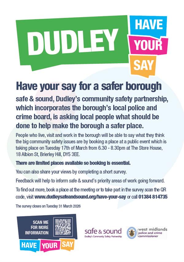 Please find below a chance to attend ‘Dudley Have Your Say’ event being held on Tuesday 17th March, 6.30 pm - 8.30 pm at The Store House, 18 Albion Street, Brierley Hill, DY5 3EE.