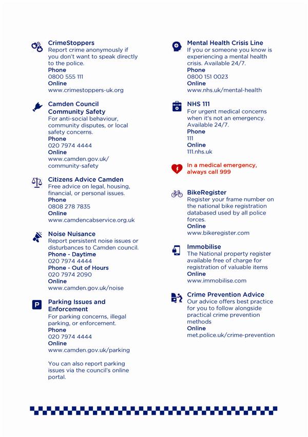 Citizens AdviceCamden Citizens Advice offer free legal guidance on housing, financial issues, consumer problems, employment concerns, and other general advice. A telephone service is offered on 0800 028 3146 and is available Monday to Friday 10am to 4pm. You can also get advice online and request a call back by visiting www.camdencabservice.org.uk ![]() CrimestoppersIf you wish to report information about crime anonymously, Crimestoppers is available 24/7: 0800 555 111 or crimestoppers-uk.org Engaging with these services ensures you receive expert assistance from teams directly responsible for resolving the type of concern you may be experiencing.