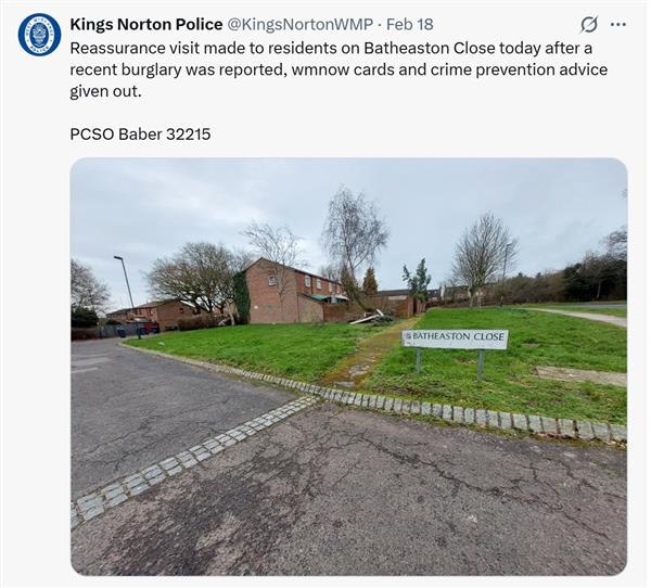As you know, we have been conducting reassurance patrols and visits to affected areas and members of the public over this past week. We are aware of the recent crimes that have been happening in Kings Norton and will be directing our patrols and reassurance around them.