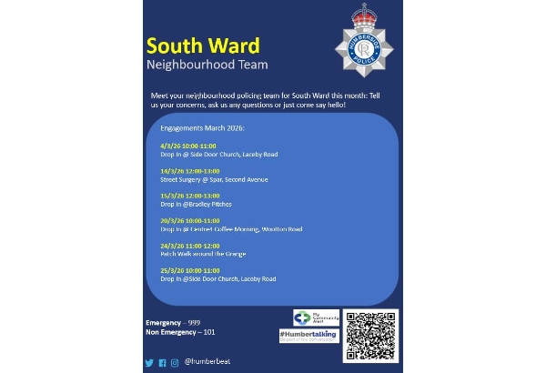 Come along to speak to your South Ward neighbourhood team this month- whether you want to raise a concern, ask us a question or just come down for a cuppa we'll be happy to have a chat. If you cannot make our drop ins, you can get in touch via 101 our non-emergency number, using the online form on the Humberside Police Website or stopping us if you see us in the street.