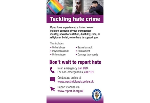 maintains a "zero-tolerance" policy regarding hate crime, defining it as any criminal offence perceived by the victim or any other person to be motivated by hostility or prejudice. Sample Campaign & Awareness Messages WMP and its partners use the following messaging to encourage reporting and community solidarity: Core Stance: "Hate crime will NOT be tolerated. If you believe an offence has been committed online, visit report-it.org.uk".