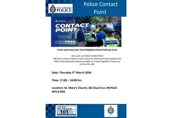 Join us for our Police Contact Point We’ll be on hand to listen to your concerns, share local crime updates and offer crime prevention advice to enable us to work together to keep our community safe.