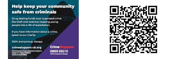 Webpage: https://crimestoppers-uk.org/get-involved/campaigns/speak-up-to-stop-county-lines-and-exploitation We're actively trying to drive reporting via the QR code (attached) and landing page (above) to ensure a consistent, national intelligence pathway. To understand more about county lines, the warning signs, and how you can protect yourself and others, please click on the above link or Call 0800 555 111 any time or use the QR Code attached to this message.