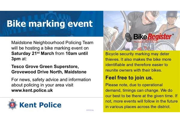 Your local Beat Officers - PC Ben Cox, PC Neil Denney and PCSO Tania Gill-Jones - will be holding a free bike marking event where you can have your bicycle securely marked and registered to help protect it from theft. The event will be at Tesco Grove Green, Grovewood Drive North, Maidstone, on Saturday 21st March 2026 between 1000 and 1500.