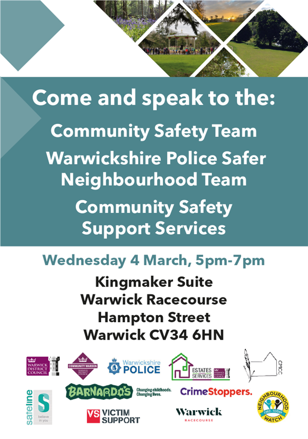 Come along and meet your local community safety partners on Wednesday 4th March, 5pm–7pm at the Kingmaker Suite, Warwick Racecourse (CV34 6HN).