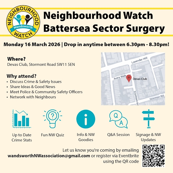 Are you interested in what is happening in your local area, do you wish to meet officers face to face to discuss specific issues, share ideas and get to know your neighbours better? If so, you are invited to attend the Battersea Sector Neighbourhood Watch surgery on MONDAY 16th MARCH 2026 between 1830-2030hrs at DEVAS CLUB, STORMONT ROAD, SW11.
