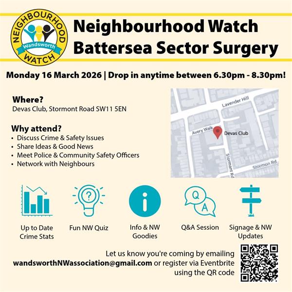If so, you are invited to attend the Battersea Sector Neighbourhood Watch surgery on 📅MONDAY 16th MARCH 2026 ⏱️ between 1830-2030hrs 📍 DEVAS CLUB, STORMONT ROAD, SW11 5EN