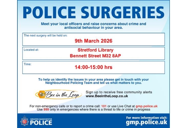 PCSO Julie will be at Stretford Library 9th March 2-3pm. Come along to say hello and have a chat about any concerns you have for your local area.