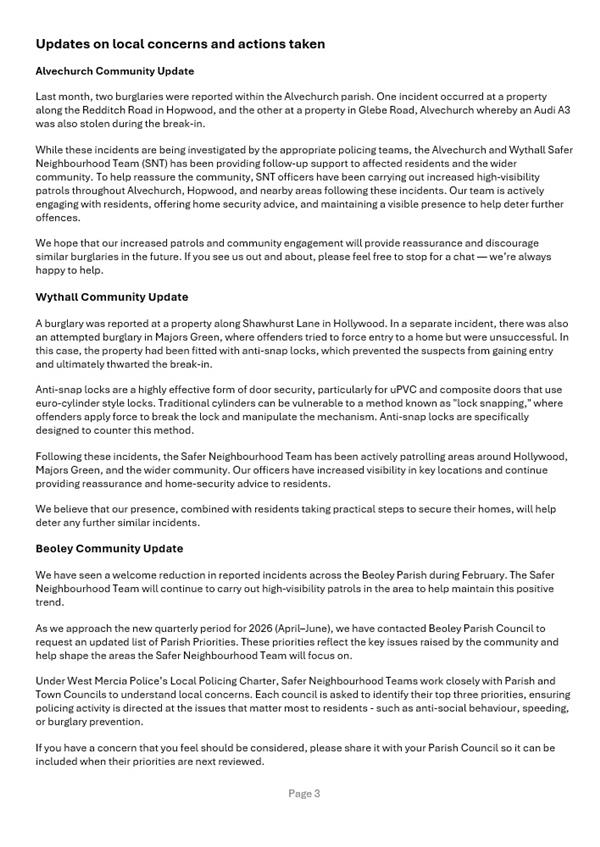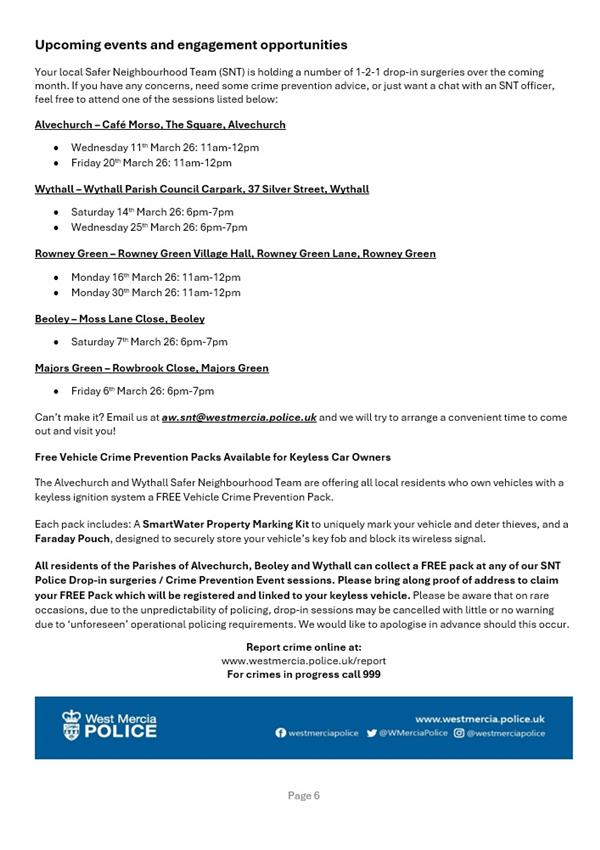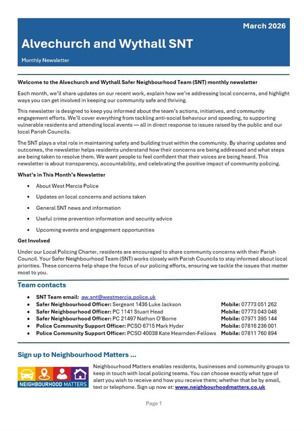 Please find attached to this email a copy of the ‘Alvechurch and Wythall SNT Monthly Newsletter - March 2026’ edition which provides various information including a overview of what your Safer Neighbourhood Team have been up to during the last month within your area. Residents of Alvechurch , Beoley and Wythall parishes will now have a new way to stay informed about the work being done to help keep their communities safe, thanks to the launch of a monthly newsletter from the Alvechurch and Wythall Safer Neighbourhood Team (SNT). The newsletter aims to provide regular monthly updates on the team’s actions, initiatives, and community engagement efforts. From tackling anti-social behaviour and speeding concerns, to supporting vulnerable residents and attending local events. The newsletter will highlight the work being done in direct response to issues raised by the public and your Parish Council.