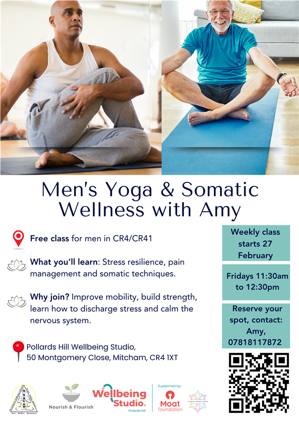 Men’s Yoga Please see attached the flyer for free men’s Yoga in Pollards Hill. Yoga gives men a powerful blend of strength, mobility, and stress relief. It builds functional muscle, improves posture, and enhances flexibility in ways traditional workouts often miss, while also sharpening focus and reducing tension so the body and mind work together more smoothly. Have a look and go and perfect your downward dog and cow face pose (yoga positions I’m trustfully told).