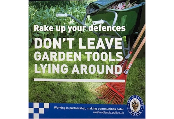 The core message—"Rake up your defences"—is a warning that tidy gardens are safer gardens. Sample WMnow Message: Garden Tool Security