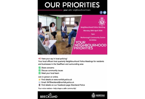 The next Neighbourhood Meeting for the Swaffham & Nar Valley and Ashill & Necton areas will take place on: All are welcome to come along, to hear about what we've been up to recently, and to discuss local issues and concerns. We also have an option to join us online via Teams if you can't come along in person. You can email the team at SNTBreckland@norfolk.police.uk for a link to join virtually. If you can’t make the meeting but would like to raise a matter, please email: SNTBreckland@norfolk.police.uk This meeting covers Swaffham and the surrounding areas including Beachamwell, Narborough, South Acre, Sporle, Narford, Necton, Holme Hale, North & South Pickenham, Ashill, Little & Great Cressingham, Hillborough.