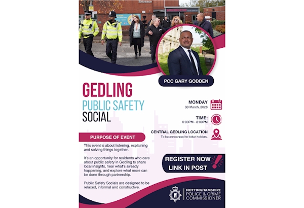 Join Nottinghamshire’s Police and Crime Commissioner Gary Godden for a Public Safety Social in Gedling, an open, community-led conversation about what helps people feel safe where they live, work and travel.