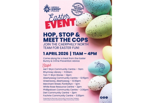 The Easter Bunny will be joining us on a mobile patrol across all Rhymney wards giving out treats to the children, with the team offering crime prevention advice as we go! We look foward to seeing you all there!