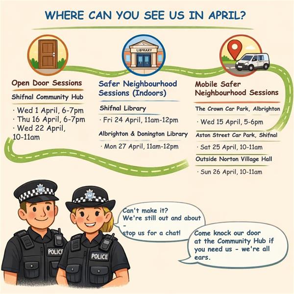 Where can you find us in April? Throughout April, your local Safer Neighbourhood Team will be out and about across the area, both indoors and out, giving residents the chance to speak with us, raise concerns, or simply say hello. You’ll find us at: Below is a full list of our April engagement sessions, including open door sessions, library sessions and mobile neighbourhood sessions: Open Door Sessions – Shifnal Community Hub Safer Neighbourhood Sessions (Indoors) Mobile Safer Neighbourhood Sessions These sessions are open to everyone, there’s no appointment needed, and no issue is too small to mention. If you can’t make one of the listed sessions, we’ll still be out on patrol, so feel free to stop us for a chat if you see us.