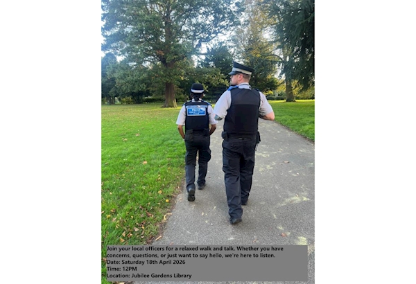 Hello everyone, Join your local officers for a relaxed walk and talk. Whether you have concerns, questions, or just want to say hello, we're here to listen.