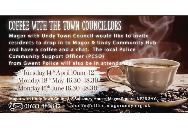 We would like to invite residents to join us at Magor and Undy Town Council for coffee and a chat to discuss any questions or concerns you may have.