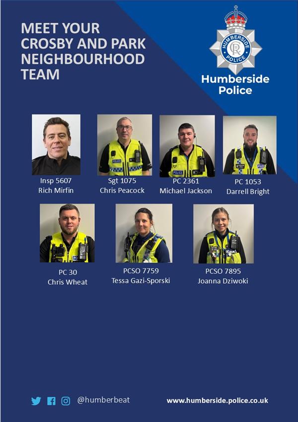 The Crosby and Park policing team have this week said our goodbyes to PC Josh Sunman who has been one of the local officers for several years. As he moves on to a new role within the force we have welcomed PC Chris Wheat to the team to replace him. Chris has a wealth of experience and previously worked on the Isle Of Axholme Neighbourhood team. For information we have attached a poster of our details, feel free to print and display in any businesses / community centres that you work at. We are based at Ferry Road Police Station if you need to speak with an officer. We will continue to hold regular drop in sessions and advertise the dates via My Community Alert