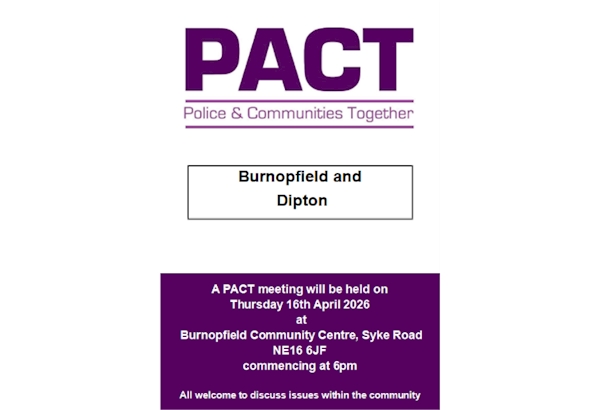 A PACT meeting has been arranged for the residents of Burnopfield and Dipton on Thursday 16th April at Burnopfield Community Centre starting at 6pm. You will be able to speak to your local PCSO/PC, County Councillors and Neighbourhood Wardens about issues which concern you in the local community.