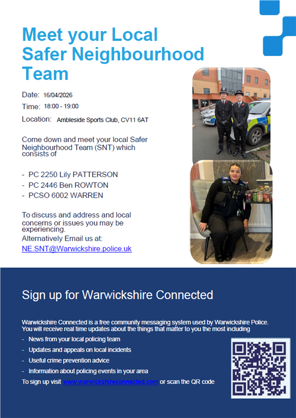 Just a reminder that your Nuneaton East SNT will be at Ambleside Sports Club today between 18:00 and 19:00.