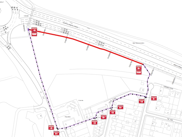 Works Update - There is a temporary footpath closure as shown below in the two drawings by the red line. The order is for 6 months commencing 20th April 2026. We hope to reduce this period. The closure is to allow construction of the new path / cycleway along this same line. There is no room to allow construction and safe passage of users as with earlier sections.
