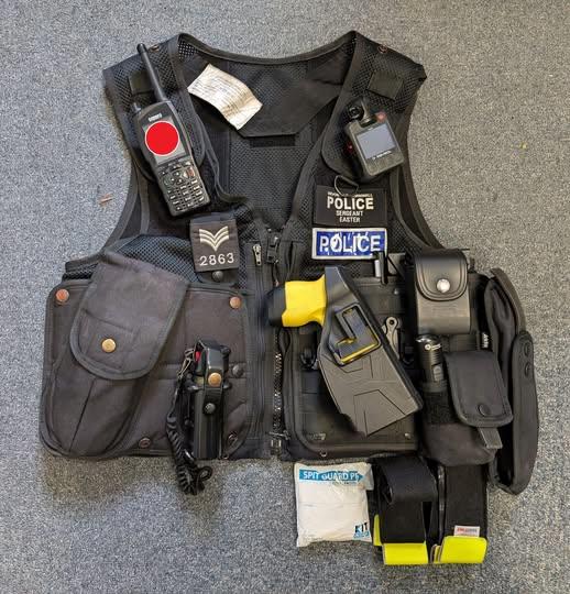 re you aware of what equipment police officers carry? It has changed a lot over the past 30 years when chain link handcuffs, a wooden truncheon and an analogue radio were the only items carried. The attached photo shows the standard equipment of a police officer operating in a front line role. Displaying from left to right we have; - Rigid handcuffs - Digital radio allowing communications with radio operators - Canister containing incapacitant “pepper” spray - X2 taser. A conducted energy device (CED) designed to achieve what is called “neuromuscular incapacitation”. Some police officers like Sgt Easter are trained and authorised to carry the device - Body worn video camera for recording evidence and police officer actions - Friction lock metal baton - Spit guard. A breathable mesh material designed to be placed over an individual’s head to protect police officers from spitting - Velcro limb restraints for use in the control of an individual’s lower limbs Police officers also wear ballistic armour under the equipment vest. This results in police officers having to carry around 2 stone’s worth of equipment! The equipment carried by police officers may been seen as excessive. Unfortunately the risk of police officers being subject to violence and being exposed to incidents involving edged and blunt weapons has increased over the past 30 years. The equipment not only keeps police officers safe, but also keeps members of the public safe as well.