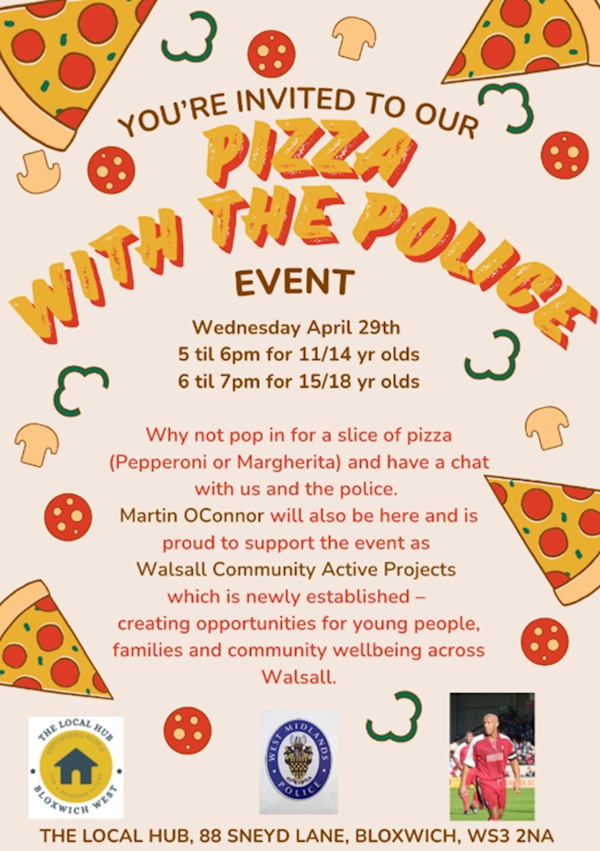 Bloxwich PCSOs are attending the Local Hub, Mossley, Bloxwich, WS3 and join us with Pizza with the Police! Event. Please see the details below for date and times. Date/Time: 29/04/26 17:00-18:00 (ages 11-14) 18:00-19:00 (ages 15-18) Location: The Local Hub, Mossley, Bloxwich, WS3 2NA
