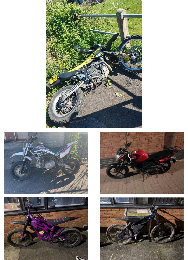 . 16x Motorcycles/ Surrons / Off-road motorcycles seized from the Swansea area with 8 being seized from Penlan Sector. . 14x Postal charge requisitions created for several offences including dangerous driving, possession of drugs, no insurance, fail to stop etc .. . 8x Stop Searches . Numerous intelligence submissions as a result of information from the day . Several of the 16 bikes were outstanding stolen.