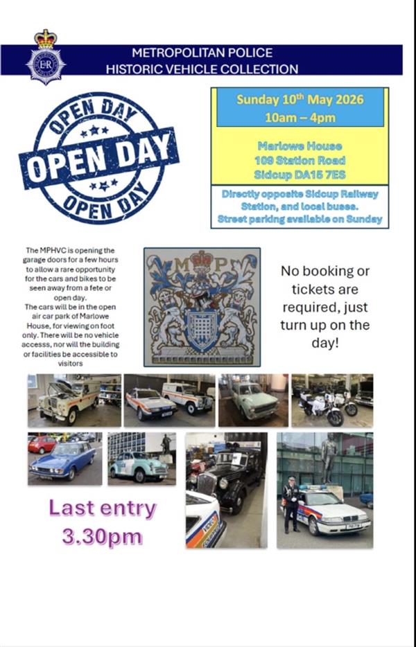 The Metropolitan Police Historic Vehicle Unit will be opening their garages on SUNDAY 10TH MAY 2026, here at Marlowe House, Sidcup. The event/display will begin from 10:00am and will be accessible to members of public until 15:30hrs, closing at 16:00hrs