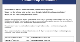 Dear Resident PCSO Jane Matschke will be holding a drop-in surgery on Friday 13th February 2026 be...